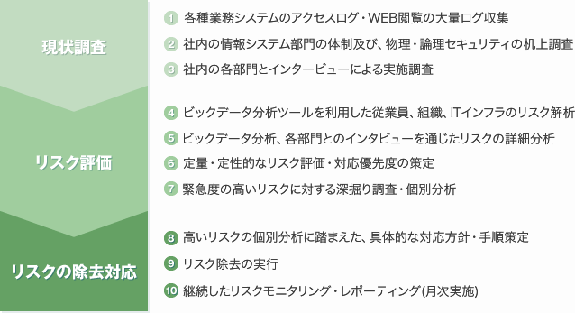 現場でのインタビュー、他社事例を含めて現状調査を行い、組織・サービス・ITの観点からセキュリティ診断を実施します。